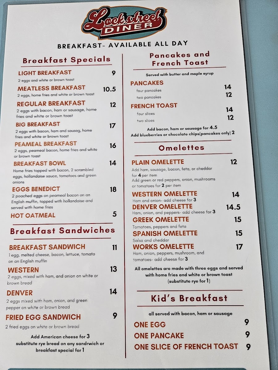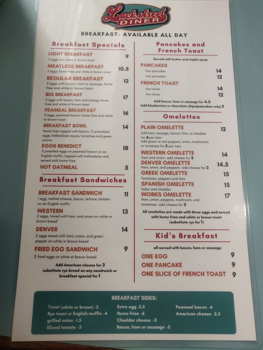 Overall, Lock Street Diner’s menu is both diverse and affordable, offering something for everyone, whether you're looking for a light salad, a hearty burger, or a classic breakfast. The quality and variety of dishes ensure that every visit can be a new and enjoyable experience.