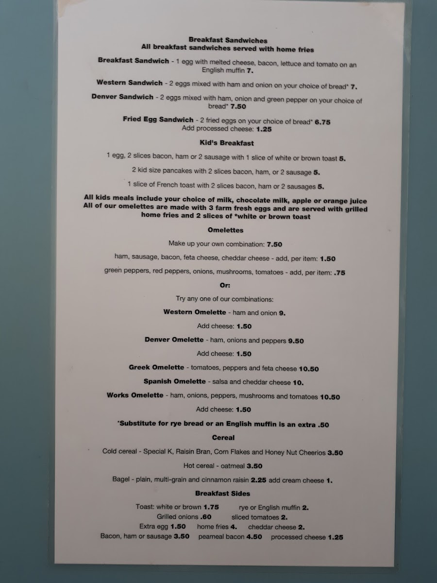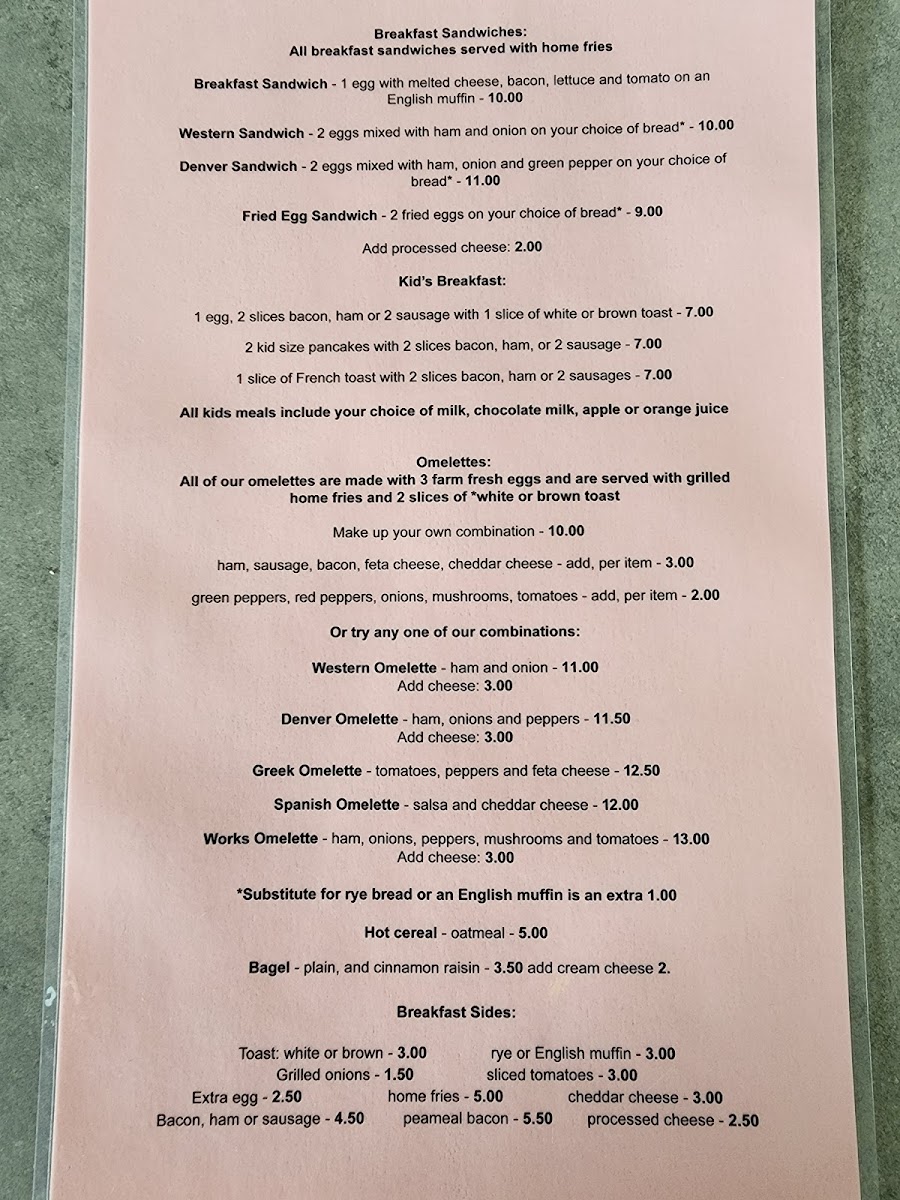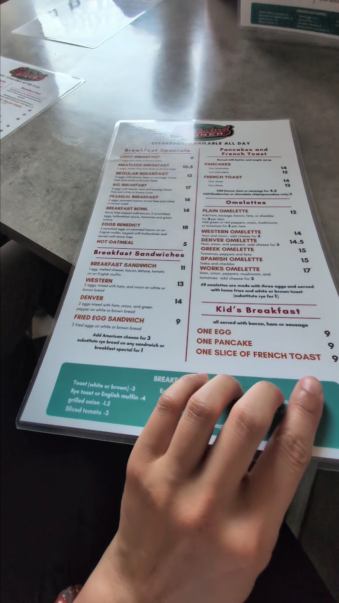In addition to the main meals, the diner offers breakfast sides such as toast, rye toast, English muffin, grilled onion, and sliced tomato. There's also a selection of hot cereal and bagels for a light bite.